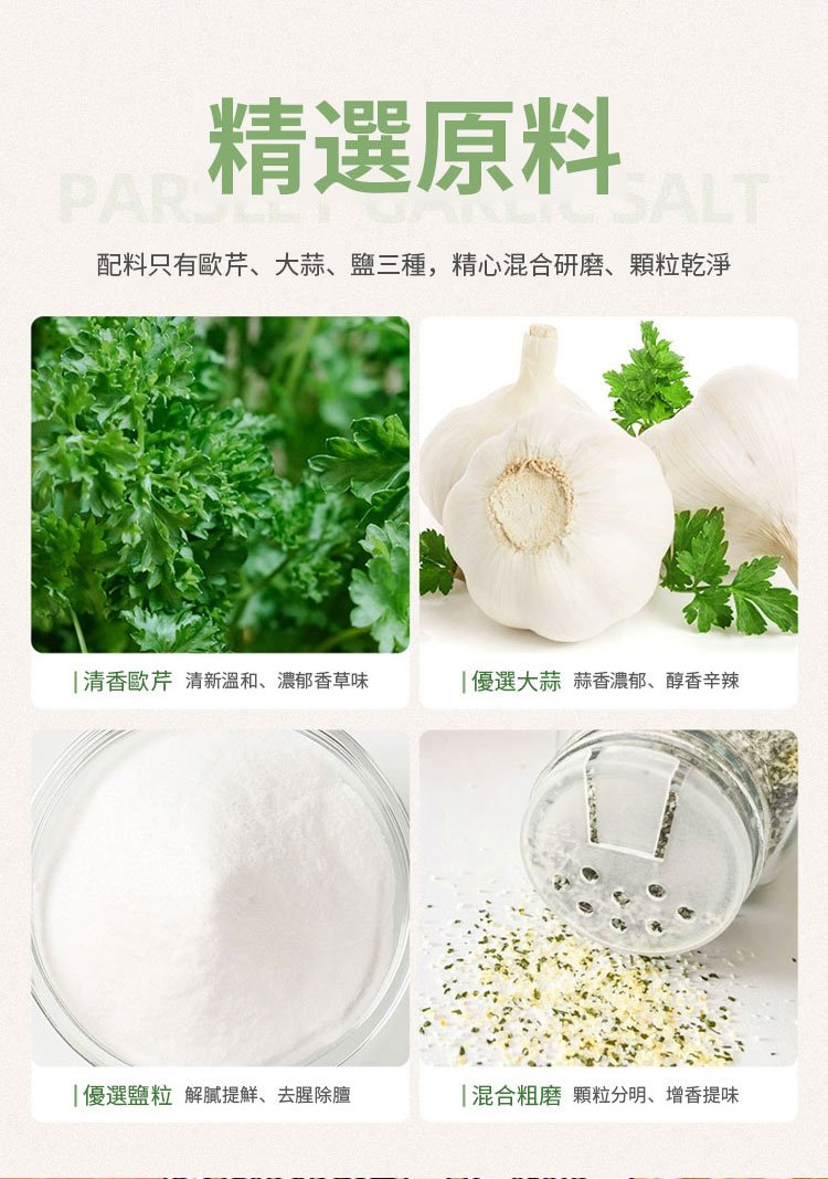4分鐘前現在下單,讓你每道菜都讓人驚艷! - 0添加健康美味!【歐芹大蒜鹽】 12入組,均價106 NT$1272